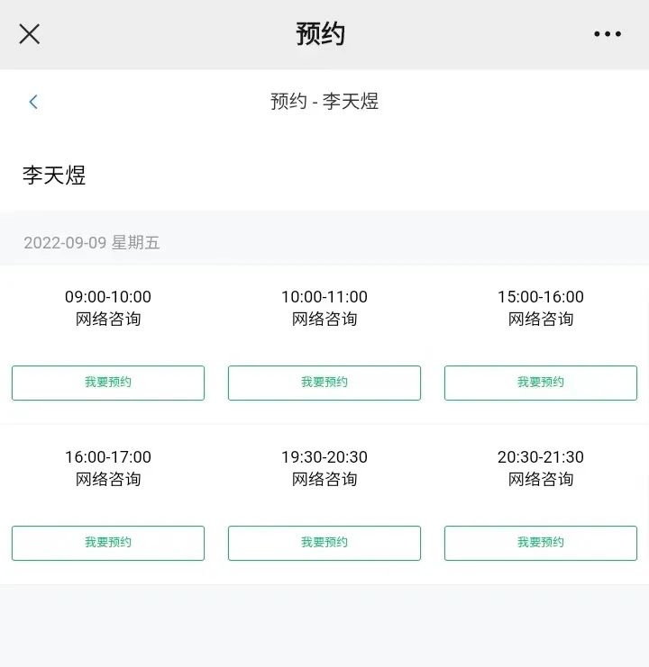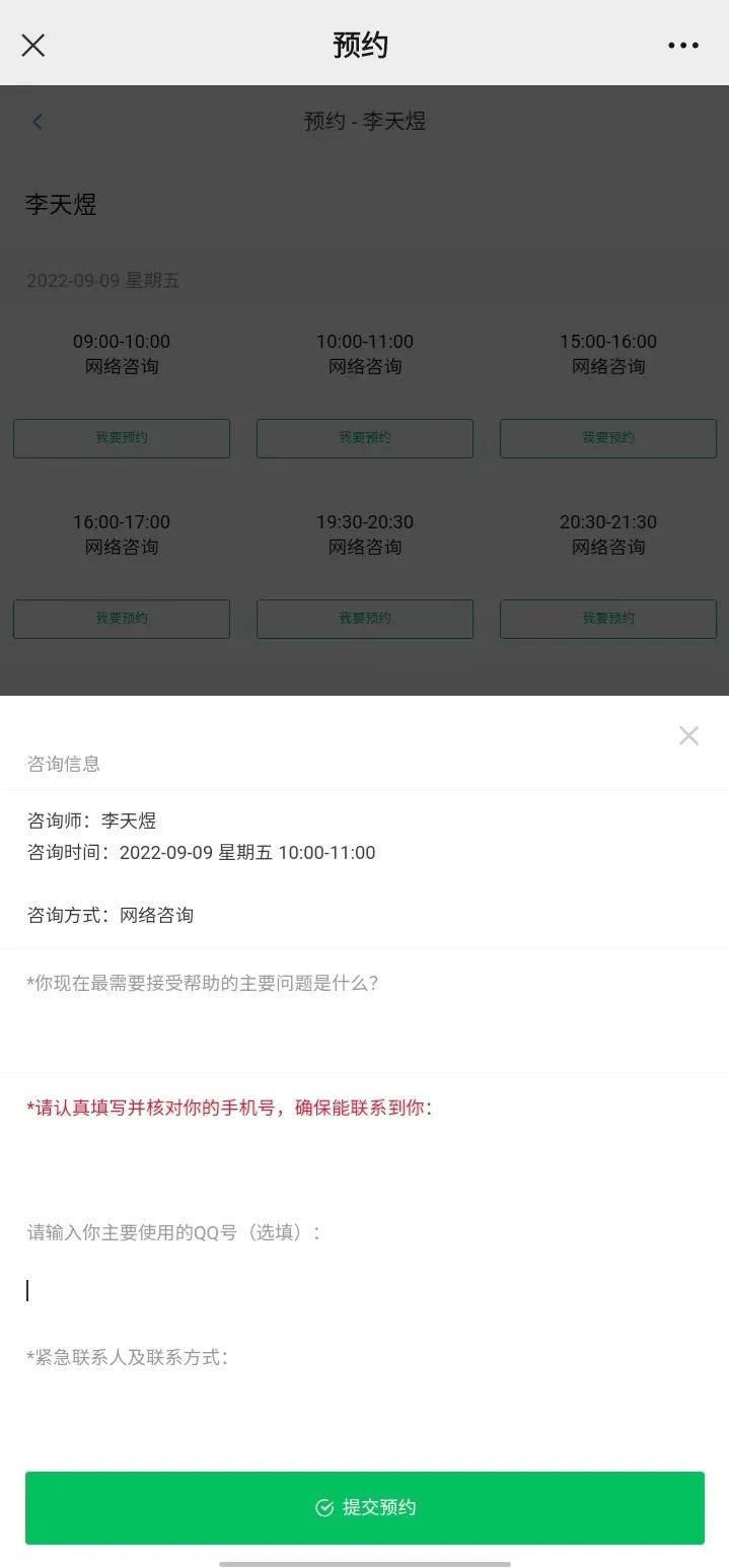⑤ 选择时间或咨询师后点击“我要预约”。