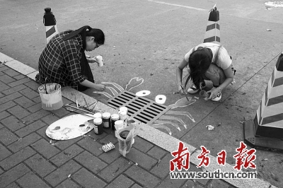 学生正在绘制井盖图案。 温昊鹏 摄 |