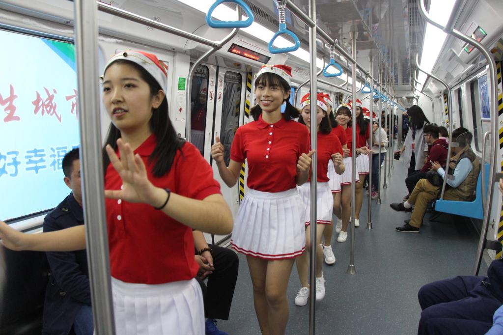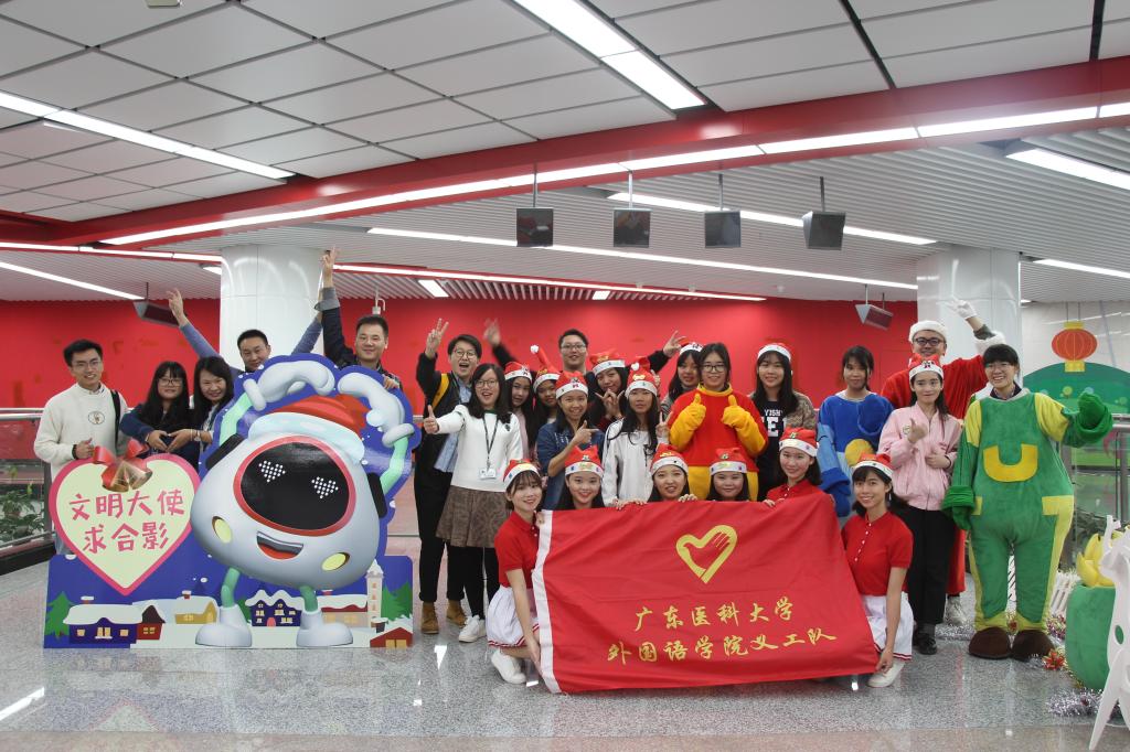 12月24日,外国语学院学生穿戴豪华圣诞服饰,走进东莞地铁传播文明乘车,引发强烈的社会反响,获得社会的一致好评。
