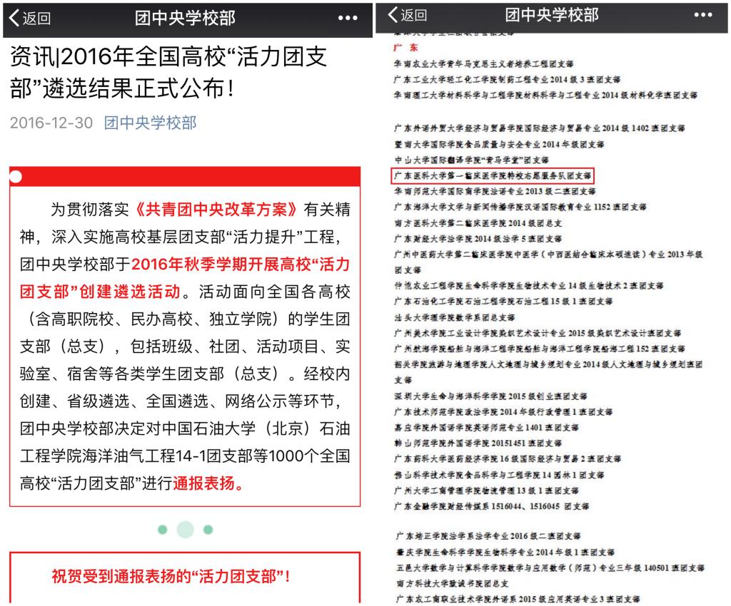为贯彻落实《共青团中央改革方案》有关精神,深入实施高校基层团支部“活力提升”工程,由第一临床医学院团委选送的特校志愿服务队团支部在团中央学校部开展的全国高校“活力团支部”创建遴选活动中,在全国1168个团支部中脱颖而出,被授予2016年全国高校“活力团支部”称号,值得一提的是,该团支部是我校首个获得全国“活力团支部”的单位。同年10月,该团支部的“医教结合”系列活动阳光助残重点培育项目在“益苗计划”即“广东志愿服务组织成长扶持行动暨志愿服务项目大赛”中,顺利通过省级赛,获得重点培育项目资助2万元。