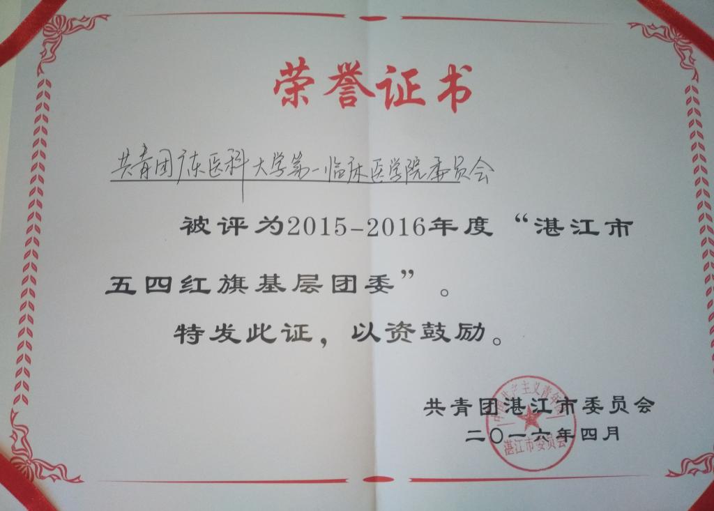 2016年是推进共青团改革的关键一年。在这一年里,第一临床医学院团委抓住机遇,迎难而上,在基层团建、志愿服务、科技创新创业方面取得突出的成绩,并在2015-2016年度五四评优中荣获 “湛江市五四红旗基层团委” 的称号。迄今,第一临床医学院团委已获得国家级奖项2项、省级奖项4项、市级奖项3项。