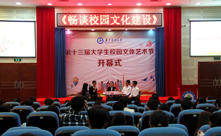 开幕式结束后,一场以《畅谈校园文化建设》为主题的访谈如期开讲。万佳萌同学担任访谈的主持人。“广医好声音”负责人雷仪婷,“药膳制作大赛”负责人赵荣臻,“越野寻标”负责人罗俊杰,“图文小说”负责人陈嘉豪等四位同学担任嘉宾。每位访谈嘉宾就其负责的项目如何围绕校园文化建设进行策划和设计分别谈了自己的思考和心得,并对我校校园文化建设提出了自己的一些看法和建议,广医好声音”负责人、校学生会主席雷仪婷同学谈到每位学生都能成为校园文化建设的主力军,丰富多彩的校园文化建设需要全校师生的积极参与和共同努力,希望广大师生为校园文化建设继续添砖加瓦。