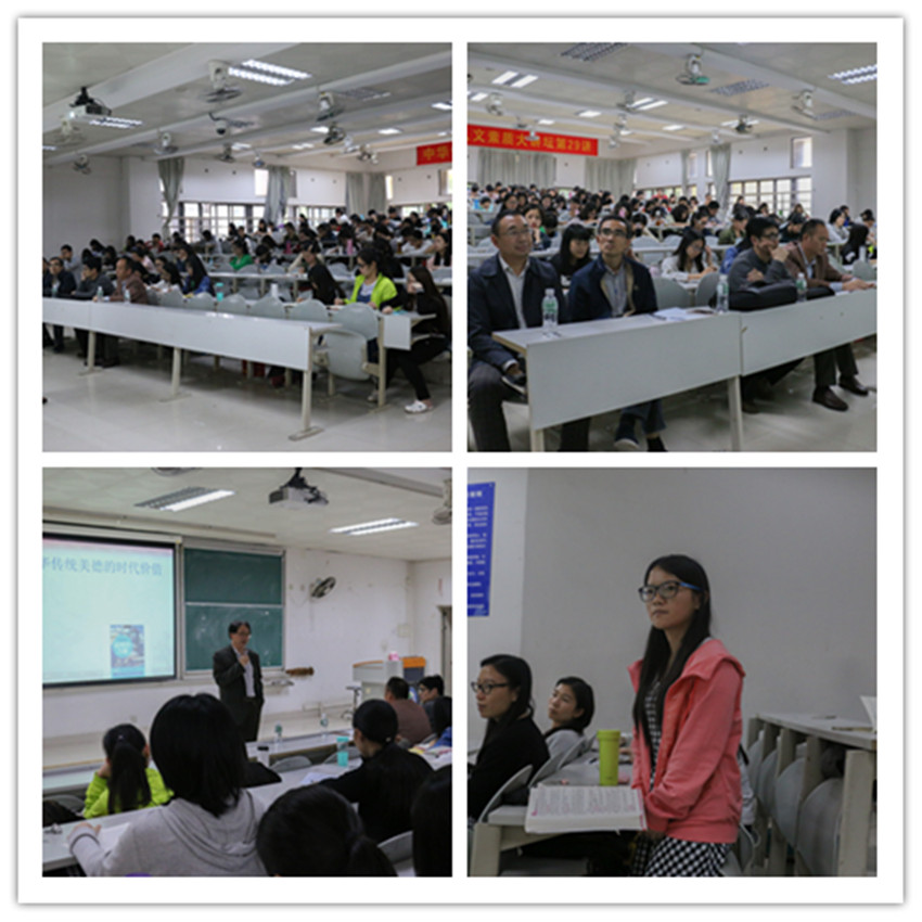 4月27日下午,人文素质大讲坛第29讲之《中国传统美德的现代意义》在东莞校区教学楼A2-1开讲。湖南师范大学王泽应教授应邀主讲。马克思主义学院黄祖辉院长、教师代表及两百多名学生聆听了本次讲座。