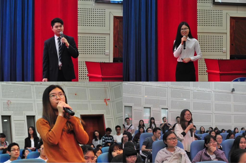 紧接着,14位选手依次进行精彩的个人职业规划展示。信心满怀的林荣斌坚定地表达出要成为“领衔医药行业的良心企业家”的决心;林舜旭以“感情问题”作比喻引出他对向往的“中医师”这一职业的思考;愿以一颗仁心成为“产房里的第二母亲”的董嘉琪坚信小花朵最终会成长为七色花;徐咏欣充分运用学校“1+1”国际交流项目这一资源,为梦想迈出勇敢的一步;李晓毅期望成为一名检验师,她说:“只有不想做的事,没有做不到的事”。选手们精彩的表现引起观众的阵阵掌声。评委老师对选手进行提问,并提出了针对性的建议。会场中,还出现了一位神秘的A观众,他提出了许多中肯的问题,甚至用英语考验了想成为一名英语教师的选手,其幽默风趣以及博学的风格引来满座的观众们的阵阵欢笑声和掌声。