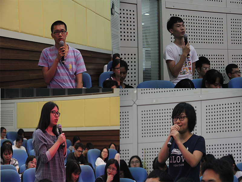 林树杰老师首先向大家讲述自己的成长故事,以职业规划的思路带动全场思考如何自我定位等问题。他表示,同学们要有新定位,珍惜大学光阴,积极全面发展。倘若选择了创业路,可通过自我定位、职业定位、计划执行这三步逐渐接近目标。林老师分享自己三天两夜攀登峨眉山的经历,因为“我只知道路在这里,所以就要勇敢地往前走。只有目标长远、意志坚定,才能在在创业路上越走越坚。”戴斌老师向在座师生介绍“创青春”创业大赛的内容,鼓舞有创业意向的同学现场发表自己的创业想法,现场为他们传授经验,提供可行性指导。