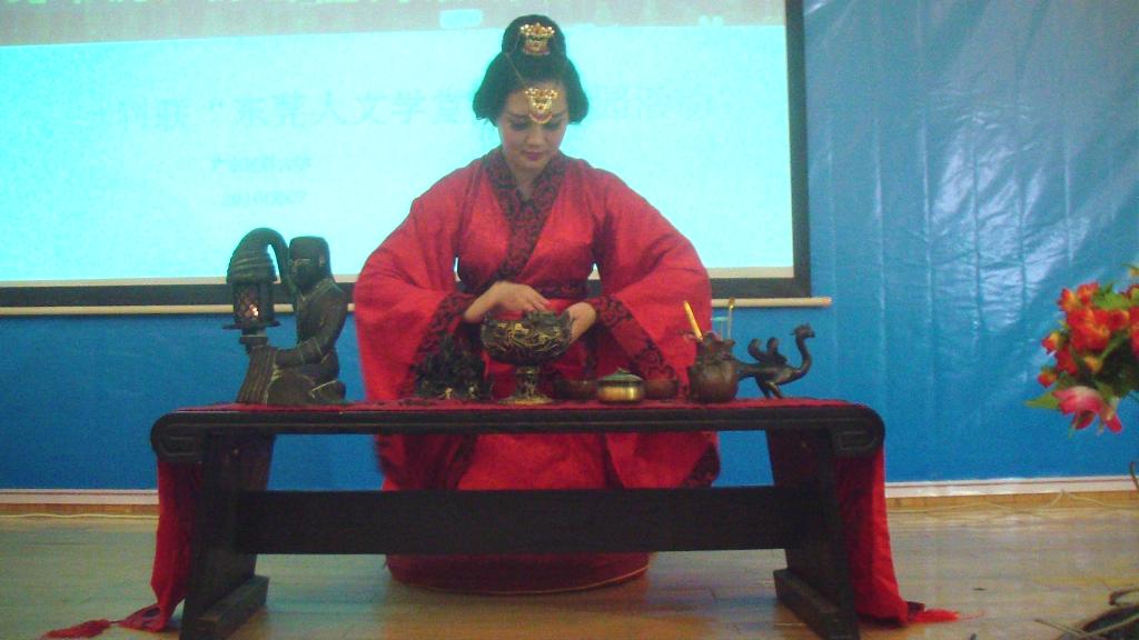 随后,王婷老师带来的香道表演吸引了全场观众眼光。在悠扬的汉乐中,王婷老师着一身红色汉服,姿态优雅地展示了祭天及燃香的整个过程。整个表演行云流水,会堂内袅袅幽香飘起。在场的观众都叹为观止,享受着一场视、听、嗅觉盛宴,领略了中华香道文化的魅力。