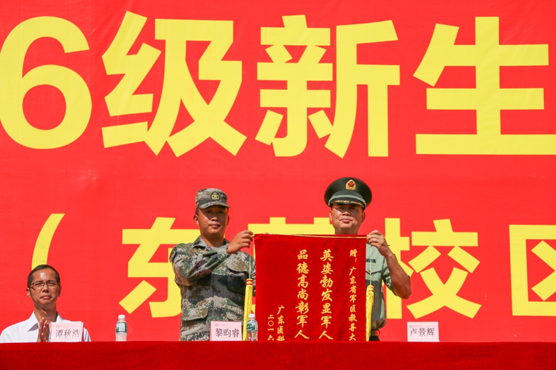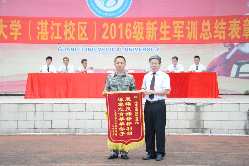 最后,党委书记、校长卢景辉在东莞校区向承训部队赠送锦旗;符学三副书记向湛江市国防教育基地赠送锦旗。在中国人民解放军军歌的歌声中,2016级新生军训总结表彰大会就此宣布结束。