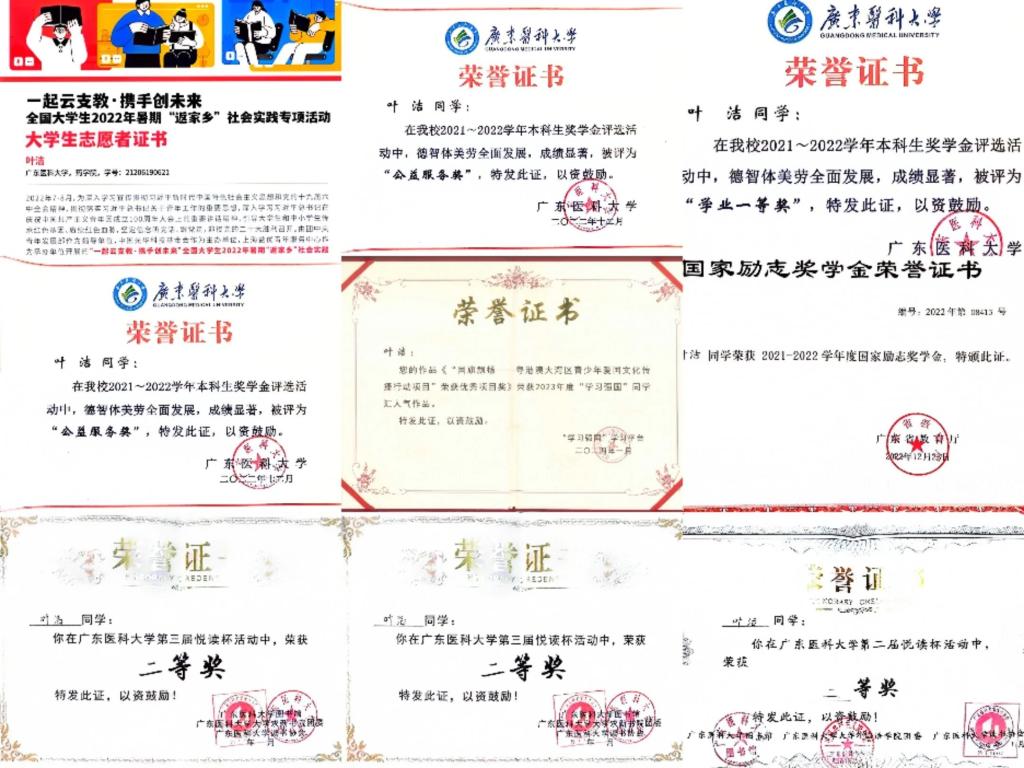 叶洁深知,立身百行,以学为基,只有如饥似渴、孜孜不倦地学习,保持一股持之以恒的韧劲,在学习阶段把专业知识基石打深、打牢,才能为青春蓄满能量。大学期间,她一直专注于专业学习,刻苦努力。经过不懈的奋斗,她的大一和大二学业加权平均分达到89.1分和89.6,均位于专业第一。大一以来,叶洁共获得了10余项荣誉,其中国家级3项、校级9项。