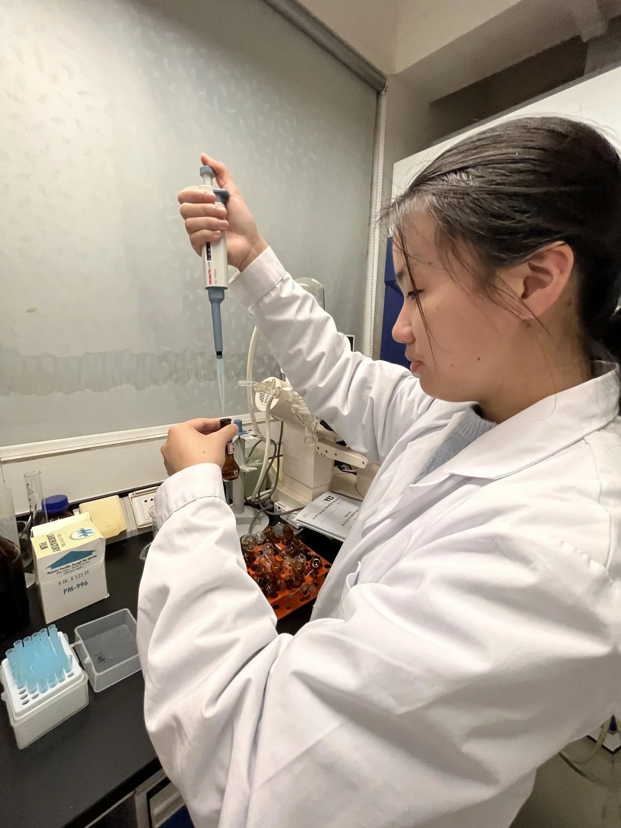 在不断向内提高自我的同时,叶洁也怀着对科研的向往不对向外探索。2023年在广食药教学点,她加入了王如意老师的课题组,并开展了关于苯烯莫德药物相关光谱的研究。在老师指导下,她和其他课题组成员设计实验方案,共同奋进。项目进行的时候,待在实验室一天对她来说是常事。经过不断摸索,苯烯莫德相关光谱研究项目最终获得广东省医学科研基金项目。