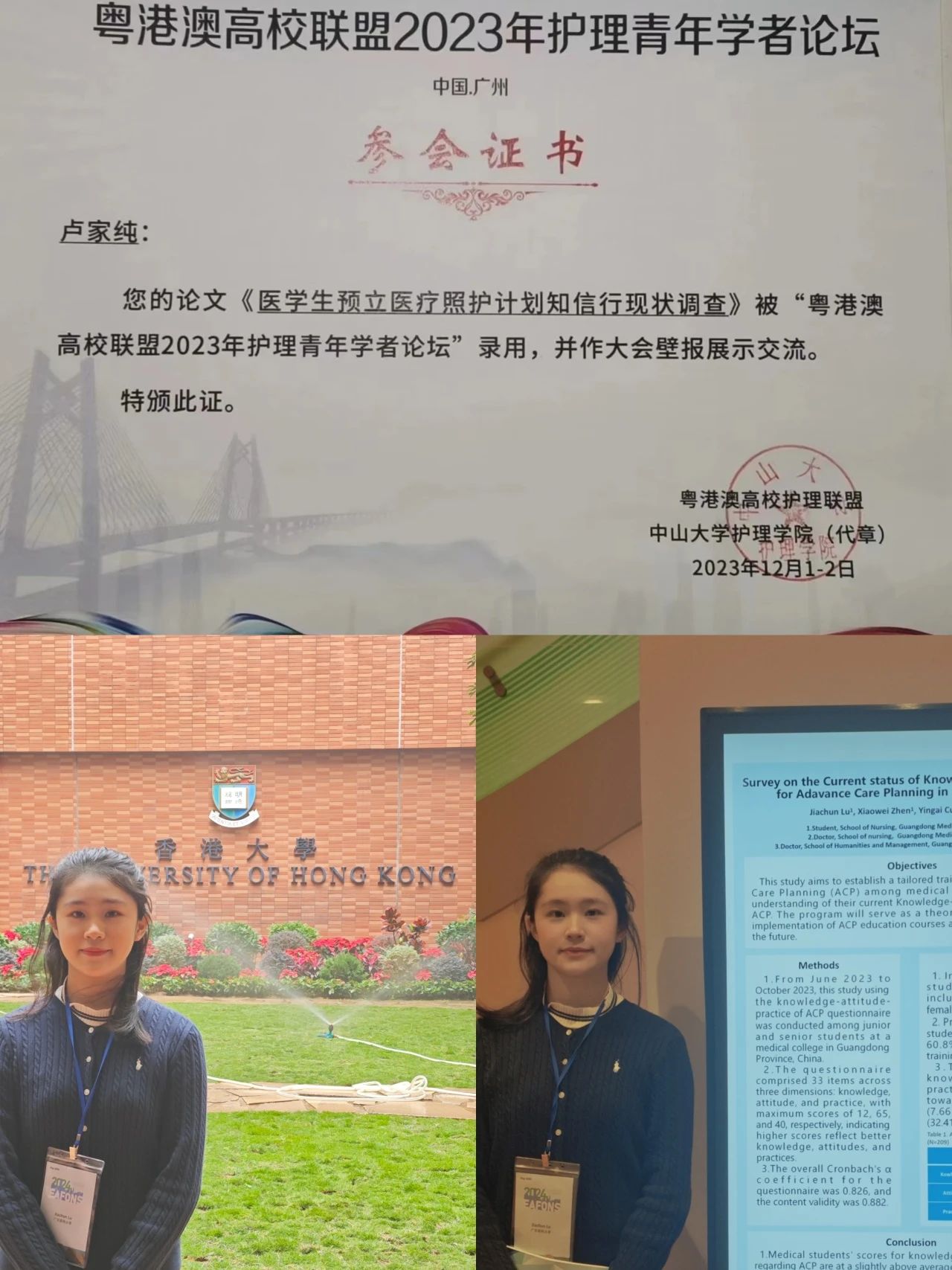 专业学科的钻研对一个学生的学业发展来说非常重要,卢家纯积极向老师请教,不断学习学科前沿内容并夯实专业基础,一步一步地走近科研课堂。她翻阅学习了大量文献,紧跟课题老师步伐,并取得了一定的成绩。她在2022年伟德国际1946源于英国大学生创新创业训练计划项目中作为项目负责人,立项课题并成功结项,另外在2023年粤港澳高校护理联盟会议及2024年东亚护理学者论坛发表壁报论文,从无到有、从本土学校到高校联盟再到国际论坛,卢家纯稳步向前,书写挑战自我的篇章。