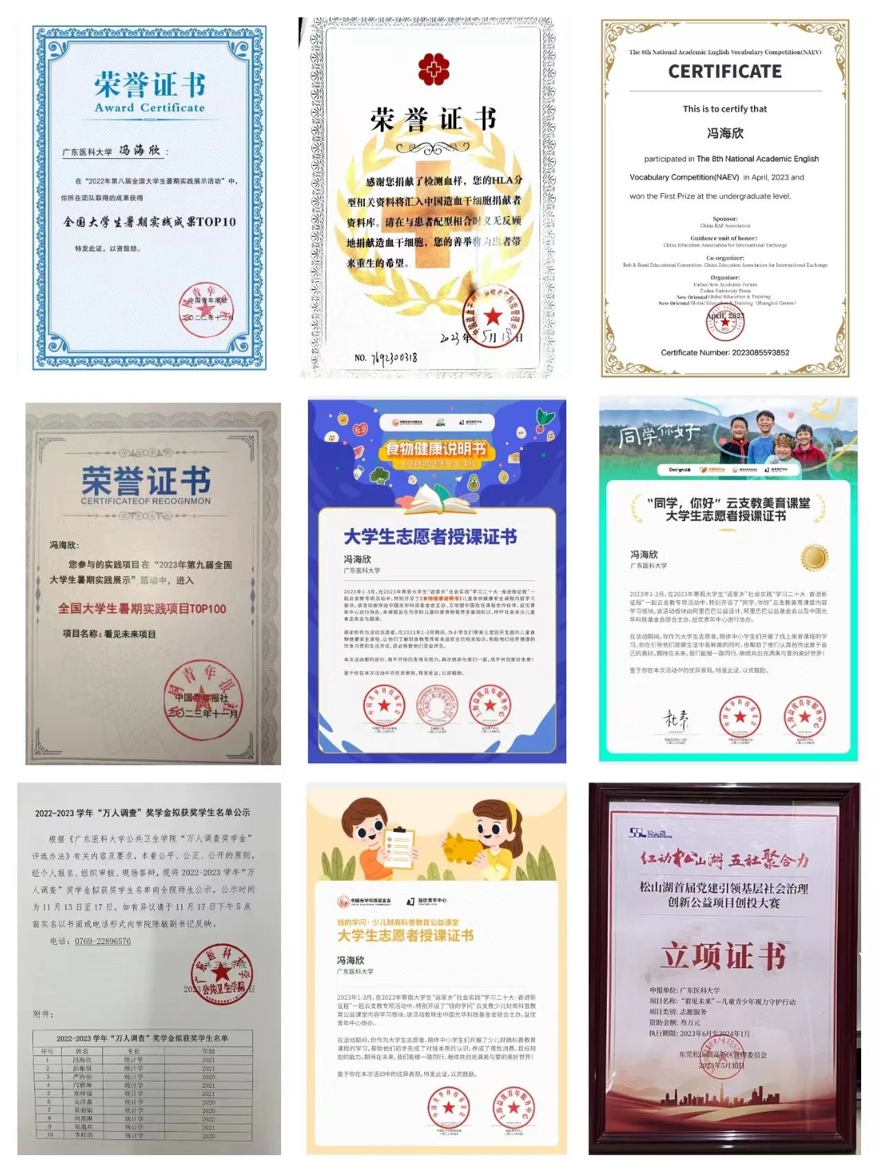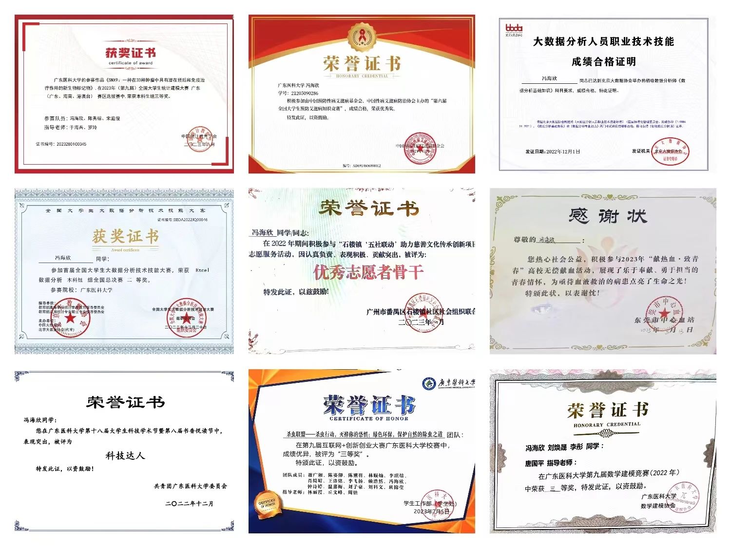 冯海欣以赛促学,参加第八届全国学术英语词汇大赛,荣获一等奖。凭借这些宝贵的经验,她积极带动班级同学共同参与“大创”、数学建模等重要赛事,并荣获全国数学建模优胜奖、全国统计建模三等奖、ACM程序设计大赛、校数学建模、挑战杯、基础医学创新研究和互联网+等领域的三等奖,同时也获得了大创、创新实验项目的立项。