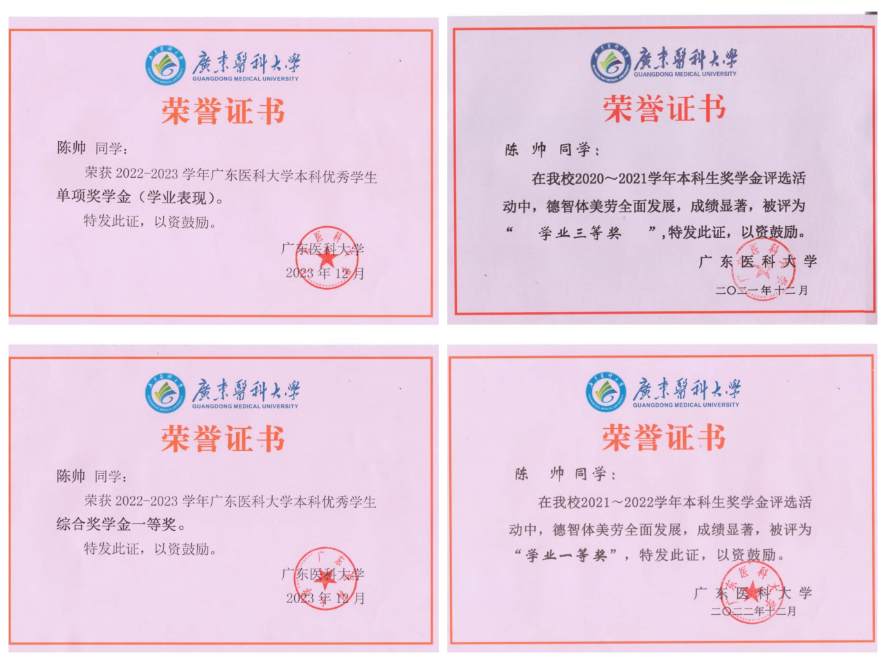 在学业方面,他连续获得学业一等奖、综合奖学金一等奖等多项奖学金,并顺利获得外国语学院英语专业辅修学位。陈帅还热衷于志愿服务活动,曾获校级优秀战疫志愿者、院级志愿公益奖等奖项。