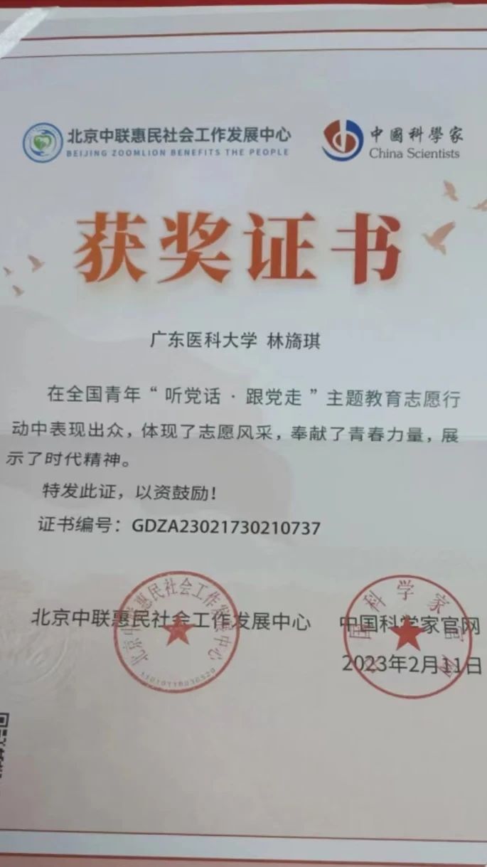 她每次都会以饱满的热情与活力去参与各种各样的志愿服务活动,连续两年参与暑期云支教志愿活动,并在疫情期间作为志愿者贡献出一份力量,累计i志愿总时长达393小时,总抗疫志愿时长达96小时,获得广东省二星志愿者、2022年护理学院“优秀志愿者”、2023年暑期三下乡“优秀个人称号”等多项荣誉称号。