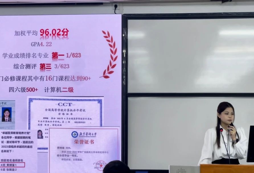 2022 年,黄靖潼凭借着清晰明确的学习目标和合理的学业生涯规划,以原专业排名第一的优异成绩和出色的面试表现,成功转入临床医学专业。