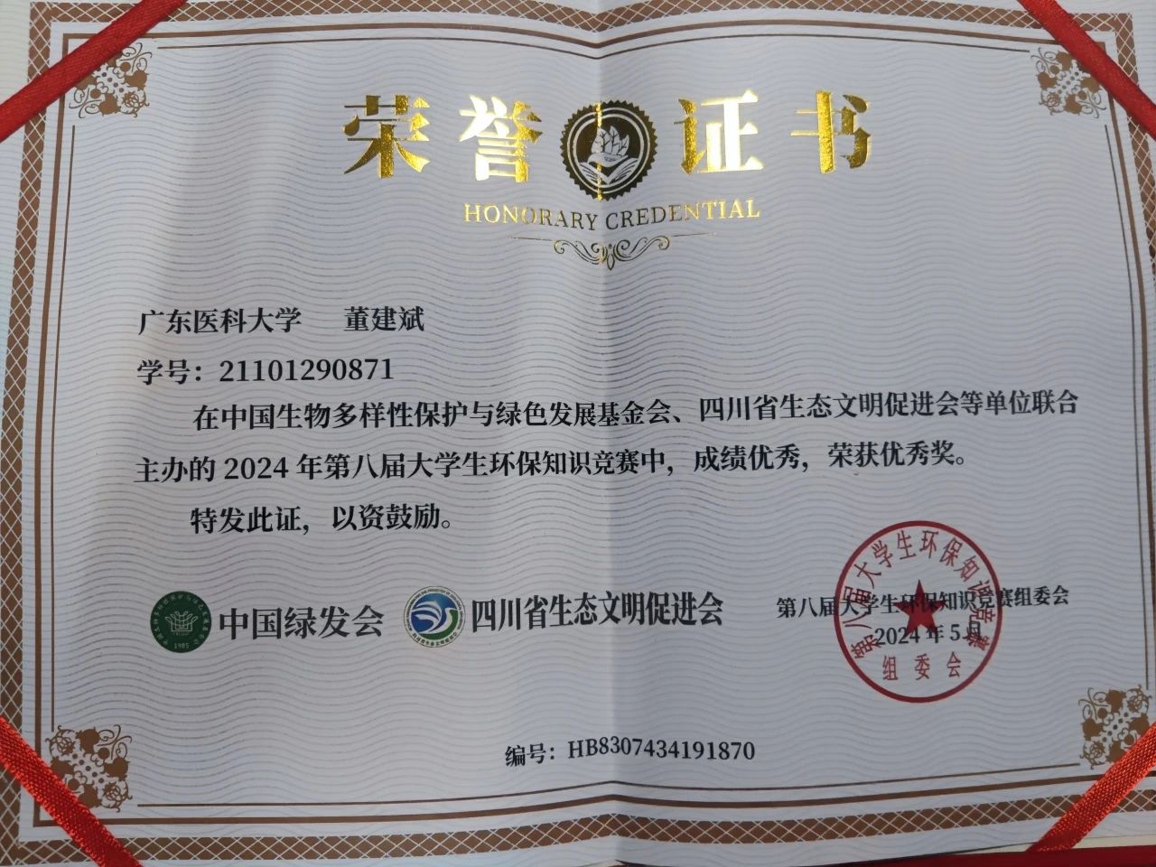 他积极参与各类课外拓展和知识竞赛,获第八届大学生环保知识竞赛优秀奖。还荣获了CCT二级证书等其他荣誉。