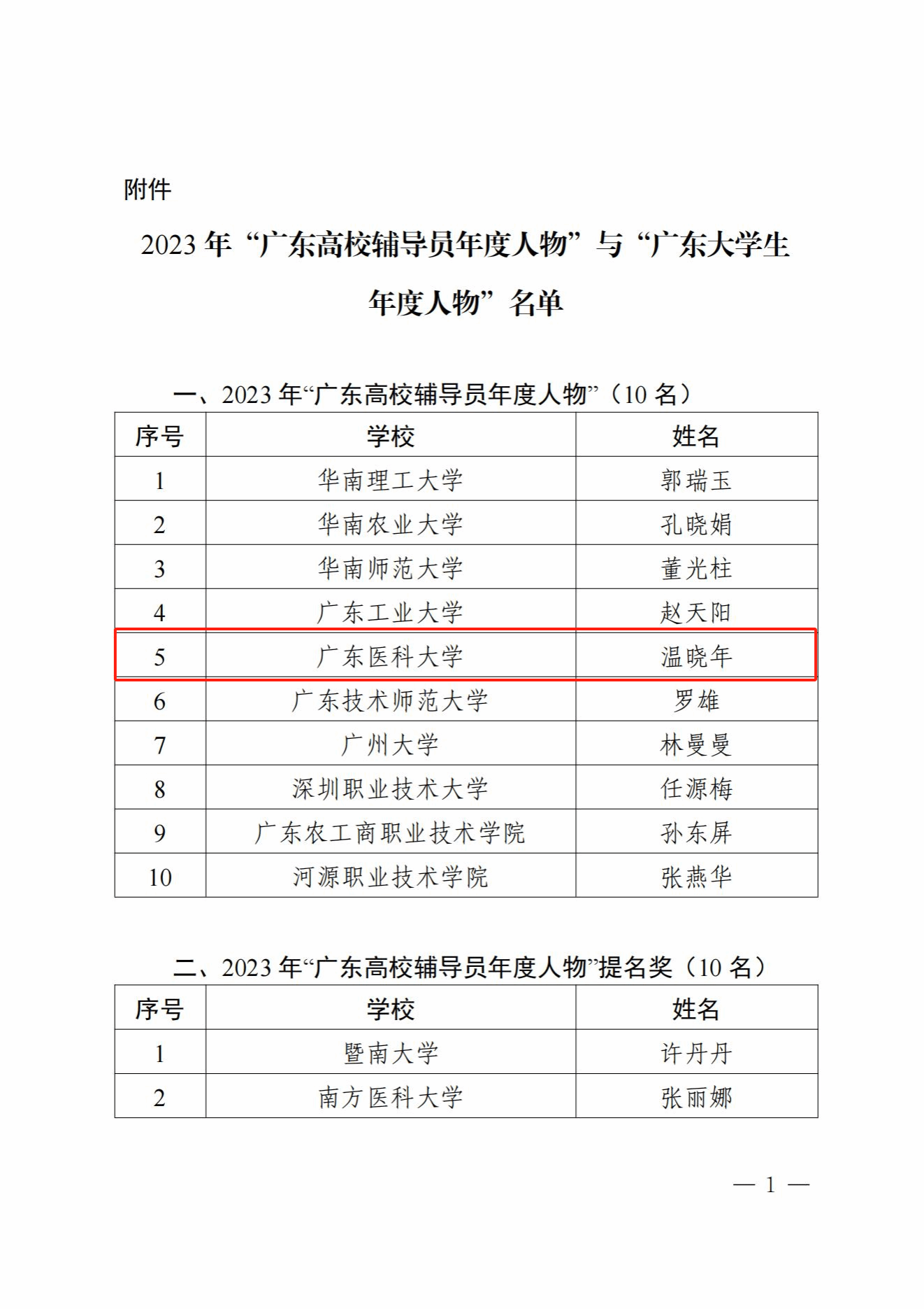 为贯彻落实习近平新时代中国特色社会主义思想,将学习贯彻习近平总书记关于教育的重要论述引向深入,大力培育选树新时代广东高校辅导员、大学生先进榜样,省教育厅组织开展了 2023年“广东高校辅导员年度人物”与“广东大学生年度人物”推选论的实践者”→经学校推荐、专家评审,评出 2023年“广东高校辅导员年度人物”10名、2023年“广东高校辅导员年度人物”提名奖10名、2023年“广东高校辅导员年度人物”入围奖20名;2023年“广东大学生年度人物”10名、2023年“广东大学生年度人物”提名奖20名、2023年“广东大学生年度人物”入围奖30名。