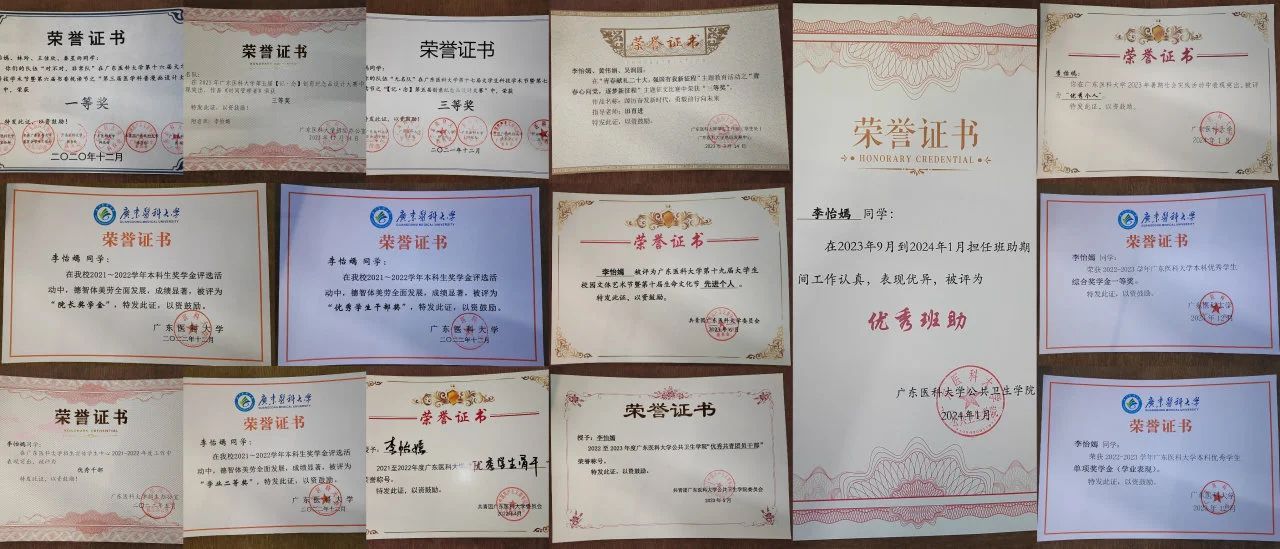 李怡嫣对待学业一丝不苟,始终保持着对知识的渴望与敬畏。在过去的四年中,她的学业成绩名列前茅,始终保持在年级前10%,并在2021年成功转专业至公共卫生学院预防医学专业。她曾获“学业二等奖学金”“学业表现单项奖学金”“第八届全国学术英语词汇竞赛三等奖”等荣誉。