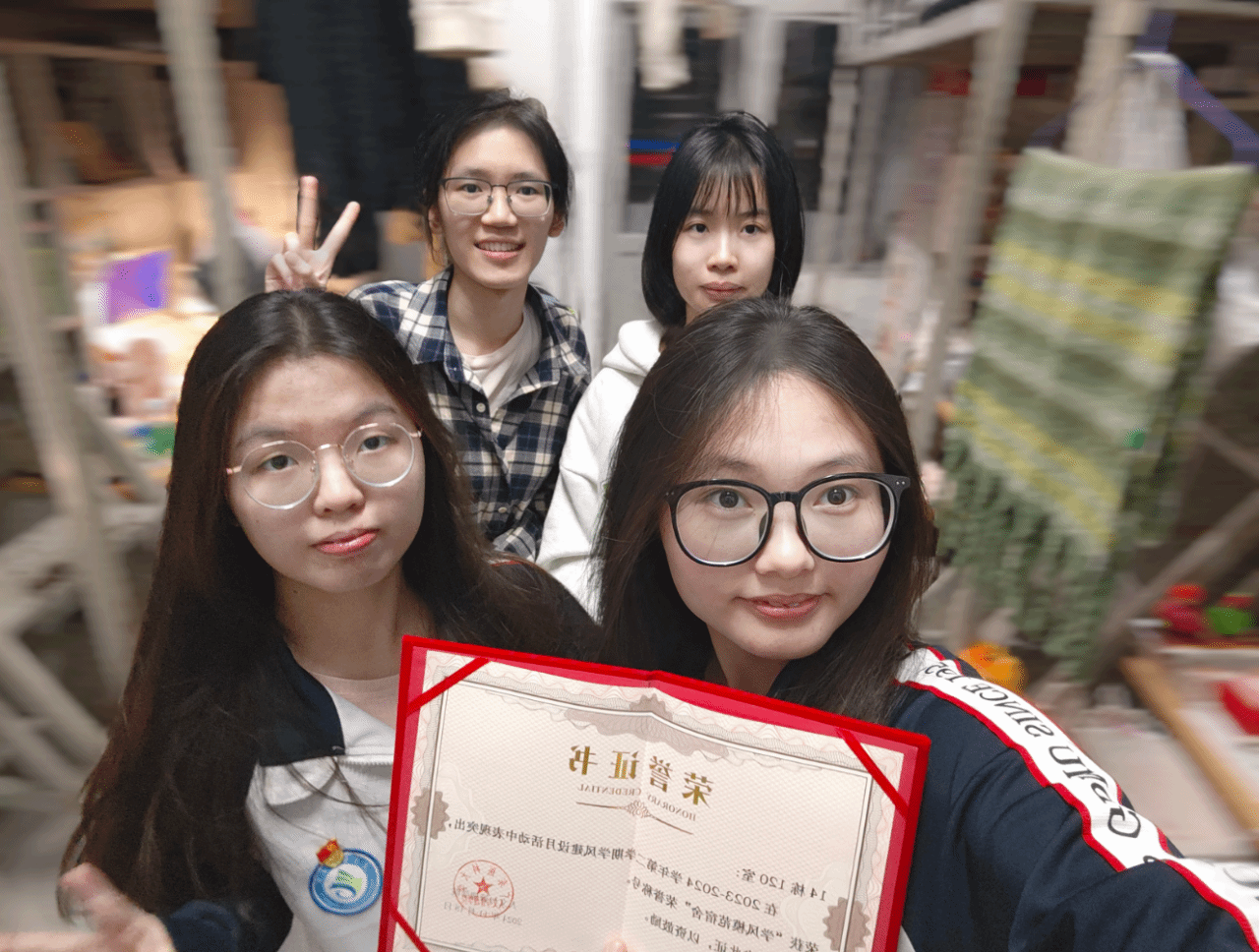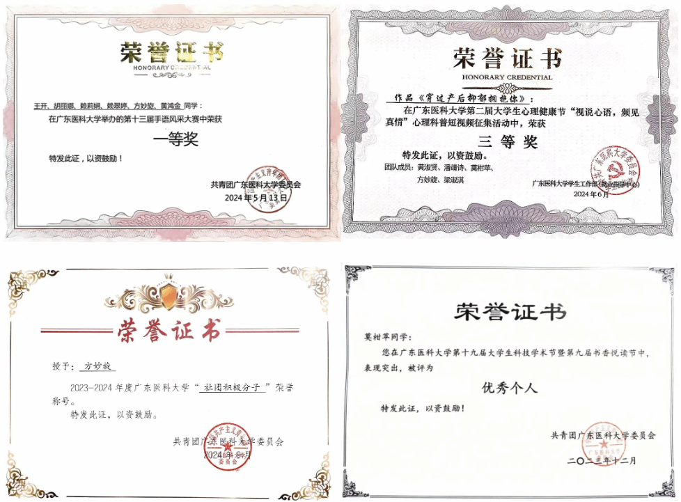 在丰富多彩的校园生活中,宿舍四人亦积极投身于各类文体活动,不断挑战自我、提升综合素养,积极参与校园文体艺术节、生命文化节、科技学术节、书香悦读节等多项文艺活动,获得新媒体创意设计大赛二等奖、手语风采大赛一等奖、“献礼二十大,奋进新征程”系列活动之摄影比赛三等奖、心理科普短视频征集活动三等奖等。