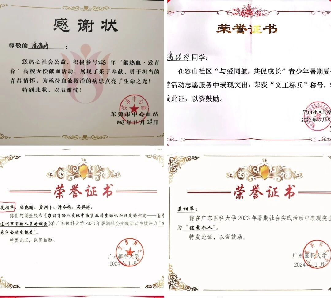 此外,宿舍成员还积极投身社会实践,其中莫柑苹同学作为队伍队长,所带队伍“相约地贫线三下乡服务队”获院立项答辩二等奖和优秀队伍、校级一般立项和优秀调研报告,个人获校三下乡优秀个人;方妙旋同学所在队伍“青心三下乡服务队”获院立项、2024年粤港澳大湾区暑期“三下乡”成果汇报暨“百千万工程”突击队三等奖。4人i志愿平台共累计志愿时长1326小时。