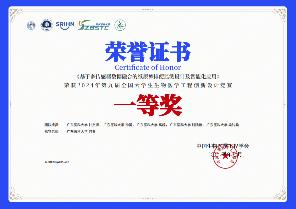 在学术竞赛的舞台上,钱陆佳积极参与全国大学生生物医学工程创新竞赛、中国国际大学生创新大赛等高水平赛事。2024年,她与团队共同完成的项目在全国数百所高校、上万名优秀学子的激烈竞争中脱颖而出,荣获第九届全国大学生生物医学工程创新设计竞赛一等奖!“竞赛不仅是比拼,更是成长。”她说,“在团队协作中学会沟通,在反复打磨中提升专业,这比获奖本身更珍贵。”