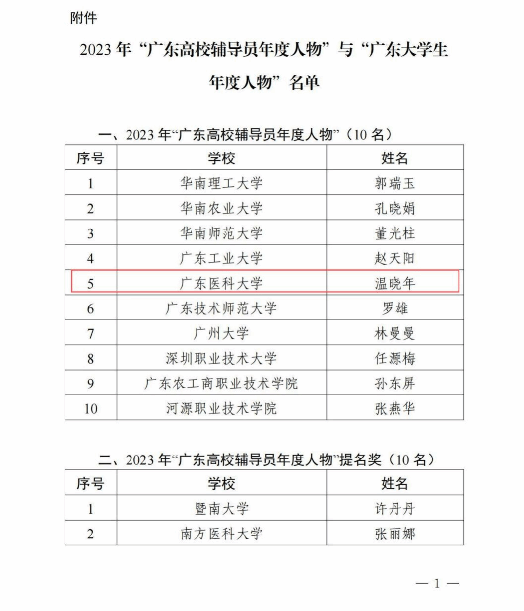 近日,2023年“广东高校辅导员年度人物”推选展示活动结果揭晓,我校生物医学工程学院辅导员温晓年荣获2023年“广东高校辅导员年度人物”称号,这是继2015年后,学校辅导员再度获得这个广东高校辅导员的“最高荣誉”。